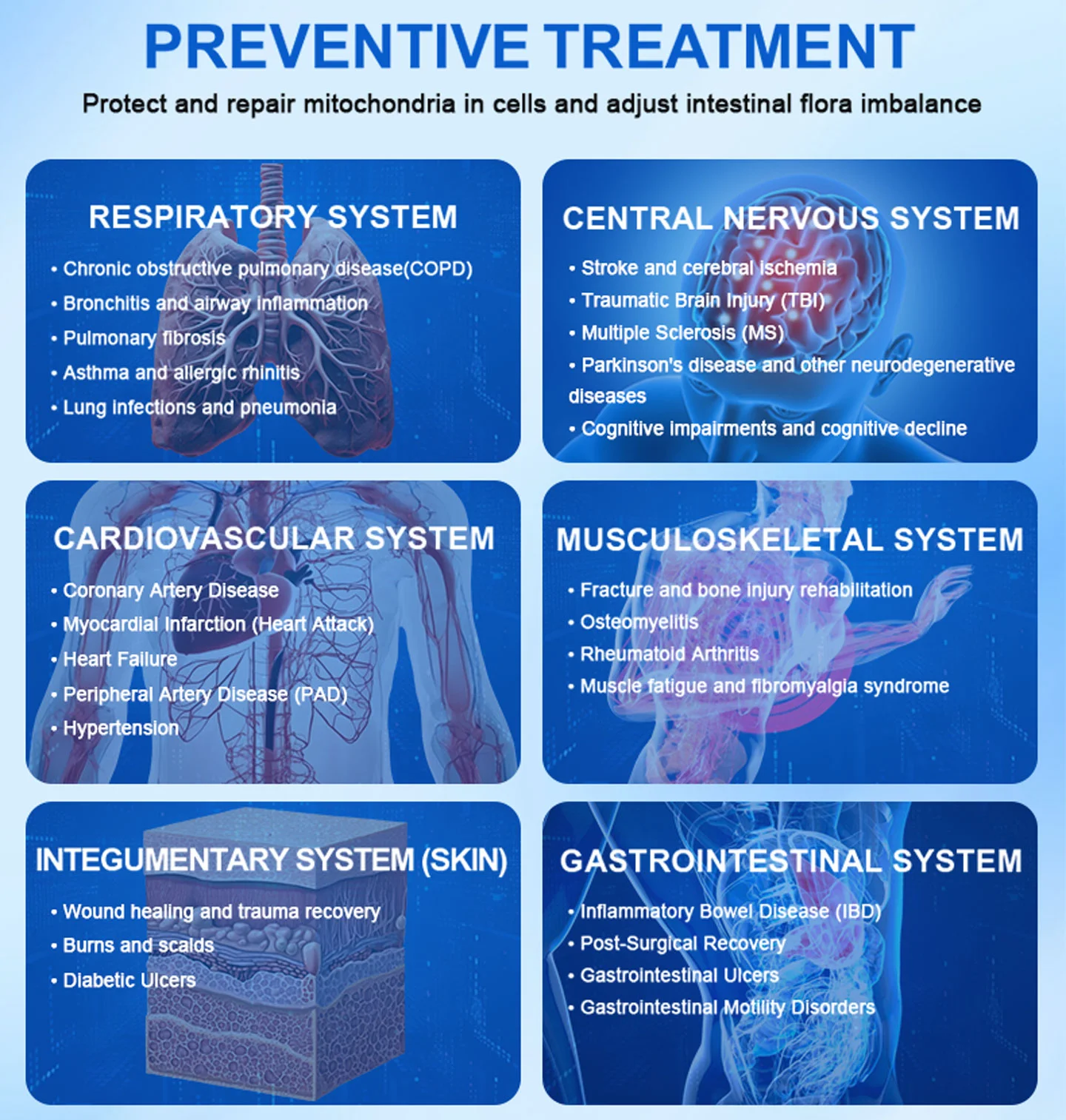 ▪ Tissue diseases: brain trauma, brain dysplasia, insomnia, nerve damage (facial paralysis, deafness, optic neuropathy, etc.), crush injuries, cervical and lumbar spine diseases, poor wound healing, diabetic foot, etc.