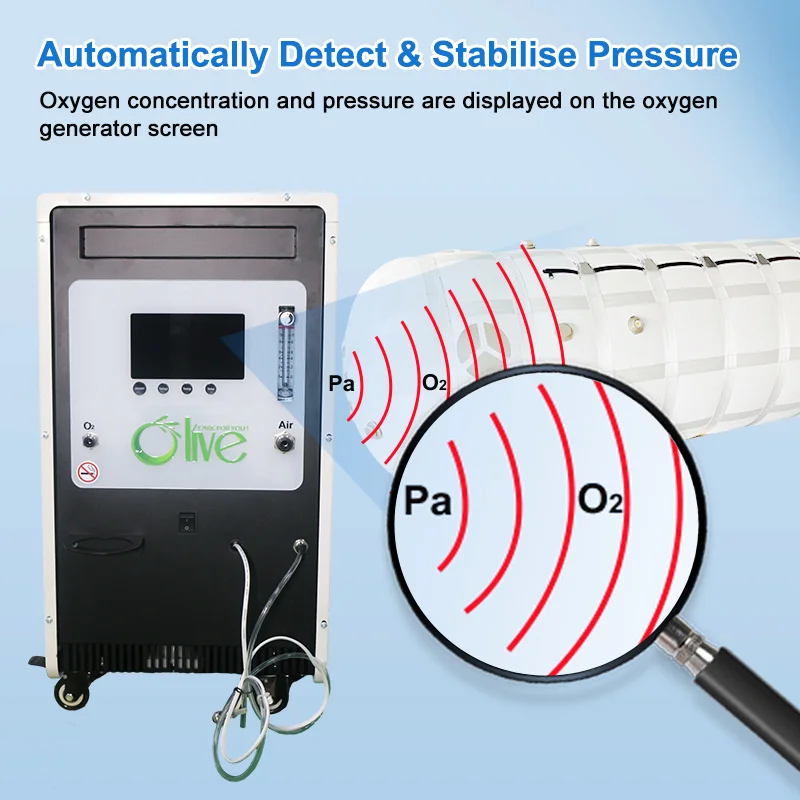 Lcd display pressure and oxygen concentration in chamber, total working time, setting time.