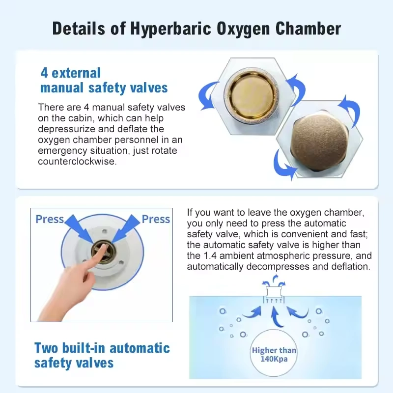 For safer use, the chamber is equipped with four pressure safety features—including automatic and manual release valves and an emergency stop switch. This multi-point system helps ensure every session runs smoothly and safely, even in high-traffic or solo-use environments.