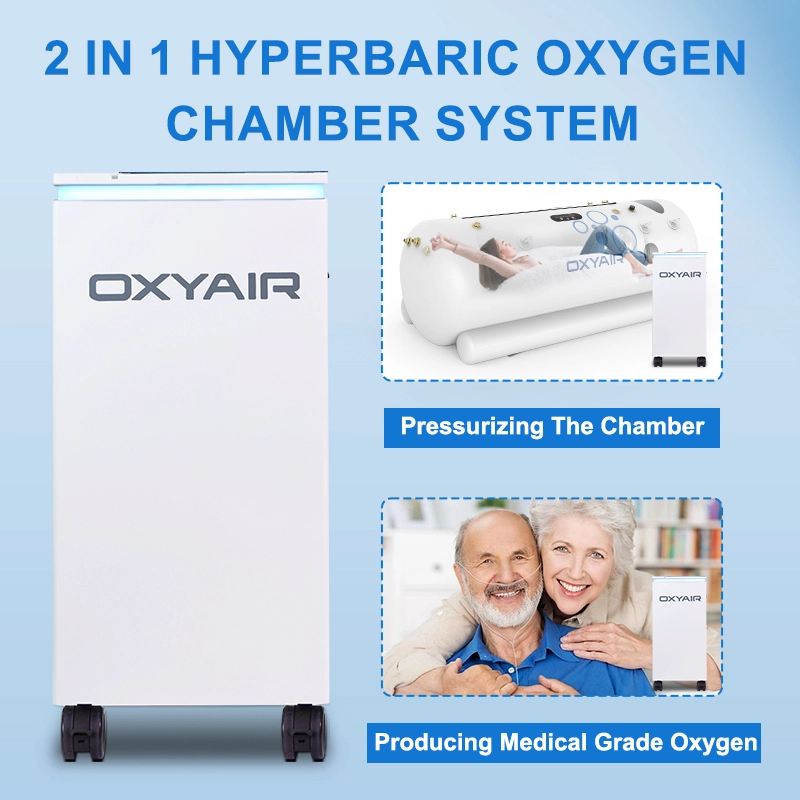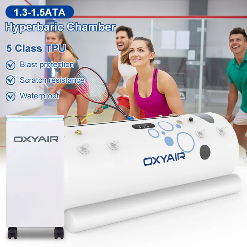 The OXYAIR soft-shell hyperbaric chamber includes a durable chamber and a two-in-one oxygen concentrator with compressor. It provides up to 1.5 ATA (7.2 PSI) pressure and delivers 93% pure oxygen through a mask for better recovery. Made from tough 5 Class TPU material and available in three sizes, it fits different body types. Large windows help users feel at ease, and full customization is available.